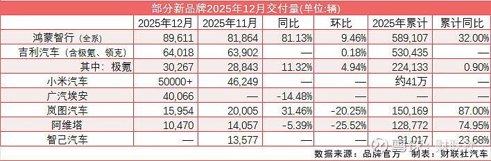 位列“新品牌”头部位置的鸿蒙智行12月交付89,611辆,连续四个月创交付历史新高;2025年,全年累计交付589,107辆,同比增长32%。具体到单一品牌,问界全系12月销量57,778辆,全年超42万辆;智界交付突破1万辆,连续三个月实现交付破万;享界单月交付突破8,800辆。