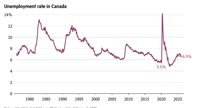 加拿大统计局: 由于1月份工作或找工作的人数减少, 失业率降至6.5%,这也是16个月来低点。