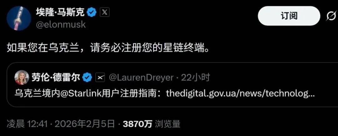 马斯克转发了乌克兰数字转型部发布的一份关于在乌克兰境内注册Starlink终端的新指南。