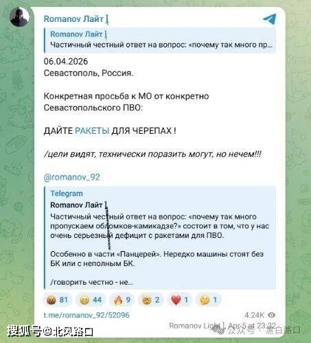 4月5日,罗曼诺夫呼吁:“塞瓦斯托波尔(克里米亚)防空司令部向国防部提出明确请求:给我们提供道尔/铠甲导弹!但我们却一无所有!!!”