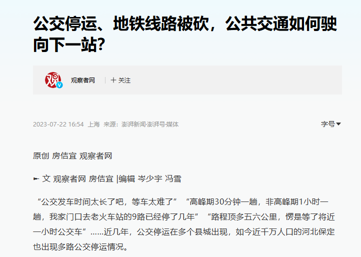 硬币的另一面是,据多家媒体披露,不少中小城市的公交线路因为亏损在减班,甚至停运。