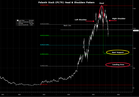 知名投资者、电影《大空头》原型人物迈克尔·伯里警告称,Palantir股价将出现重大技术性暴跌。他发布了一张图表,表明这只高增长的人工智能股票即将暴跌近 60%。