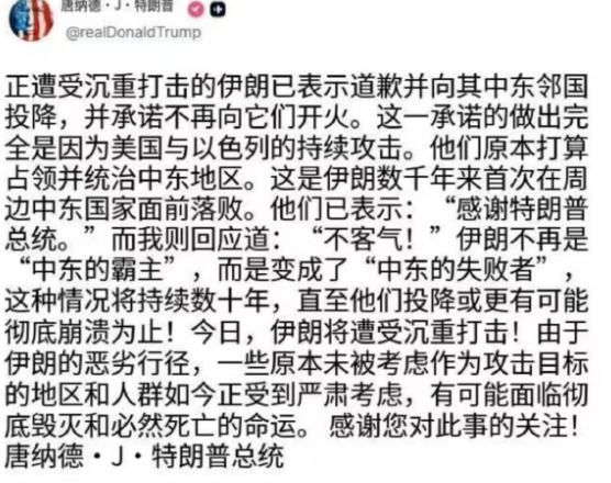 伊朗政府的这一番表态,让美国总统特朗普抓住了宣布自己“大赢特赢”的机会,立马在社交媒体平台上宣布说,伊朗总统向邻国道歉,是因为美国的持续性攻击,说这是伊朗数千年以来首次在中东周边国家面前落败。