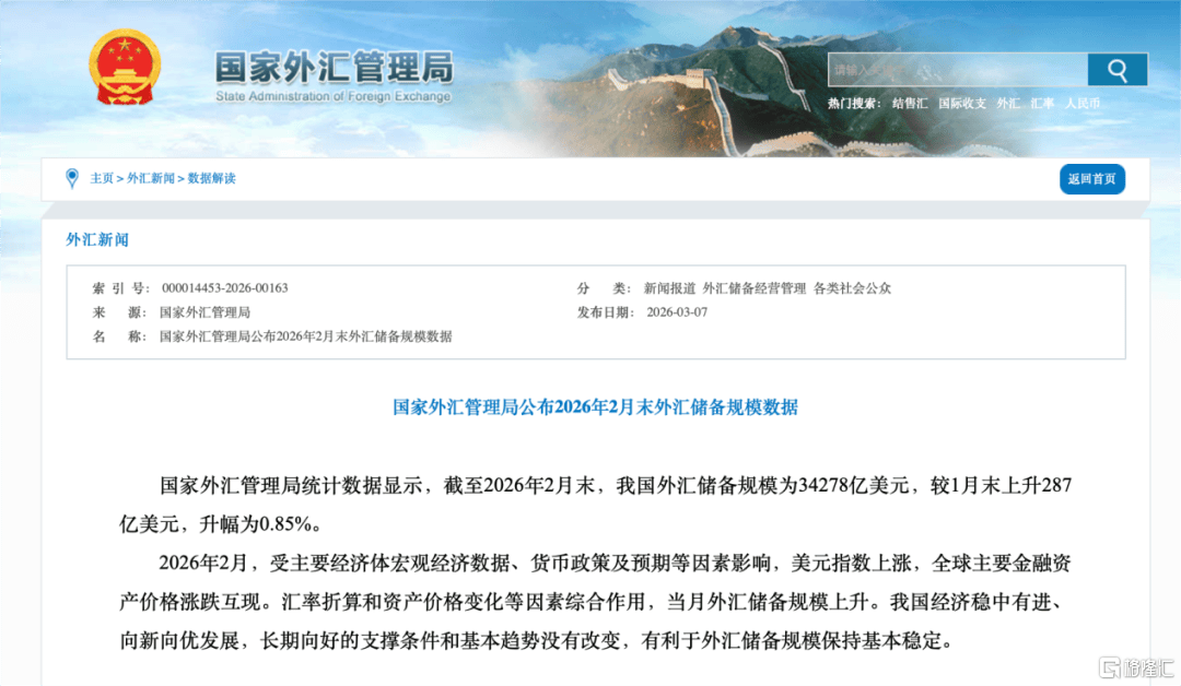 3月7日,国家外汇管理局公布的数据显示,截至2026年2月末,我国外汇储备规模已突破3.4万亿美元关口。