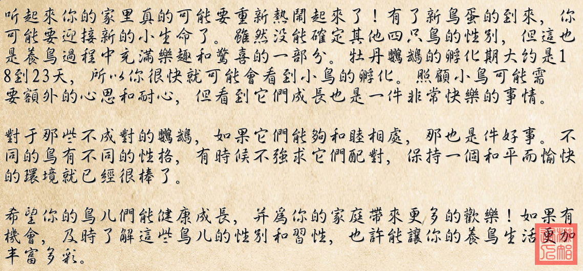 《鸟语心事》 空笼子还悬在窗台边沿 阳光里飘着去年的绒羽 食盒添满新买的谷粒 六颗心跳各自数着晨昏 蓝翅膀掠过薄荷绿尾羽 旧友与新邻隔着木栅低语 瓷窝深处藏着温热的秘密 三枚月光静静蜷在干草里 原来独行客也懂温柔 原来寂静里酝酿着喧哗 等春风叩响铁笼那天 绒毛将淹没所有孤单 水罐映出晃动的影 分不清谁与谁注定相遇 也许热闹本不需成双成对 各色的鸣叫已织成暖意 待破壳声啄开四月清晨 这房间将重新学会年轻 每片飞羽都驮着云朵 每阵扑棱都是未完故事的开篇