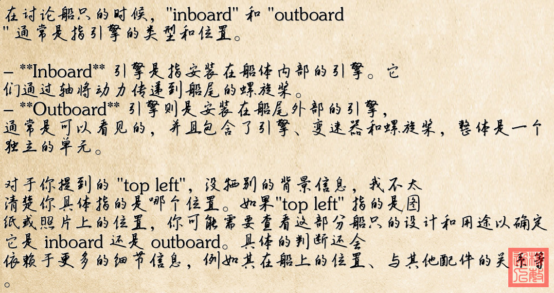 图片左上角的那种船的发动机是inboard(内置式)类型。发动机安装在船体内,通常通过传动轴连接到螺旋桨。