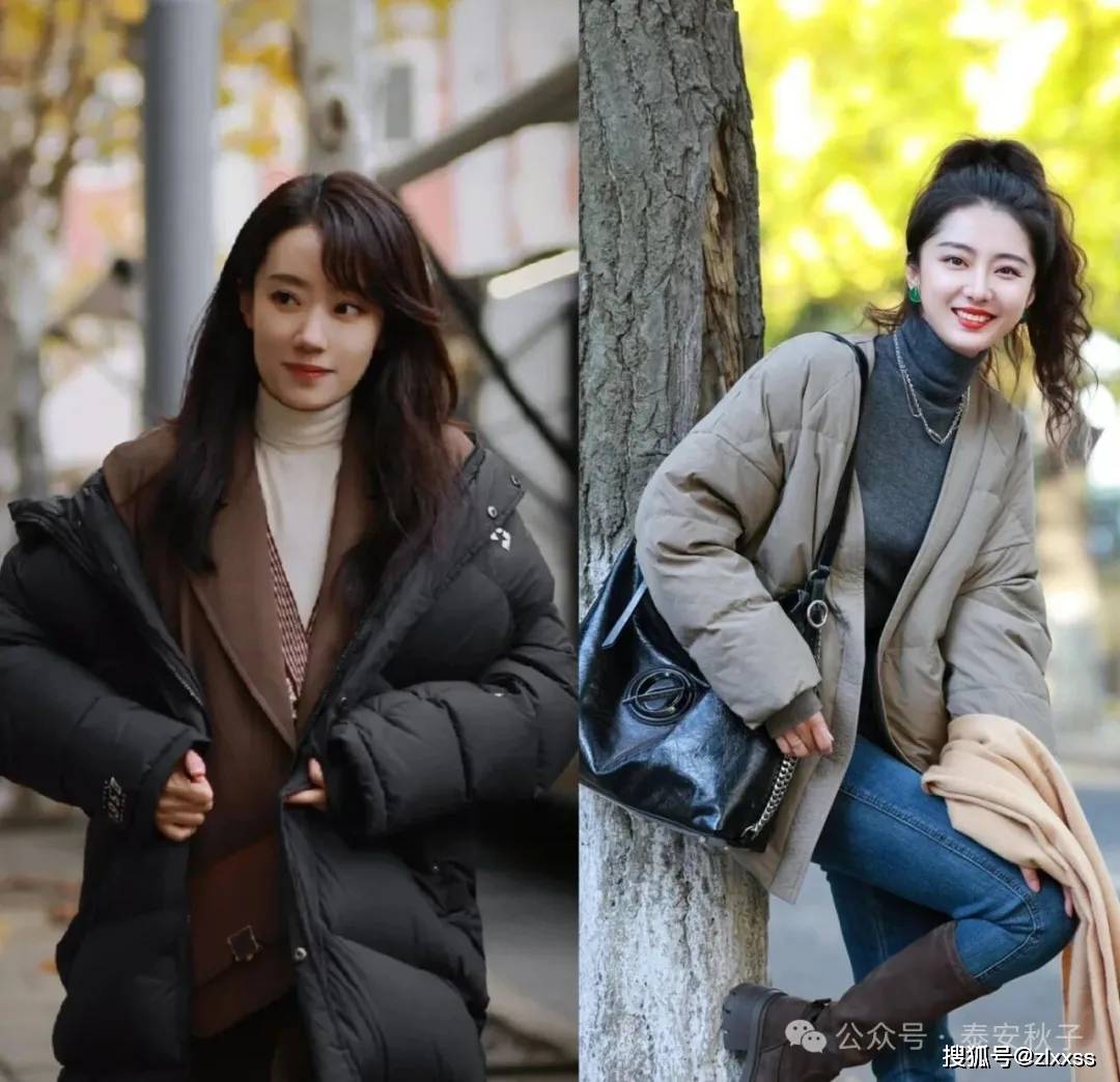 如大美女张小斐就是用黑色羽绒服叠穿了米白色的高领衫,经典的黑白色调穿出了极致简约的高级感。