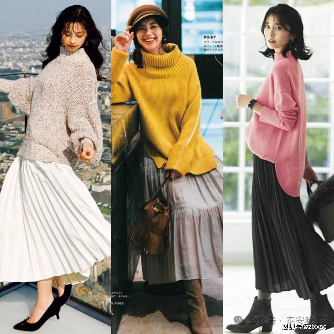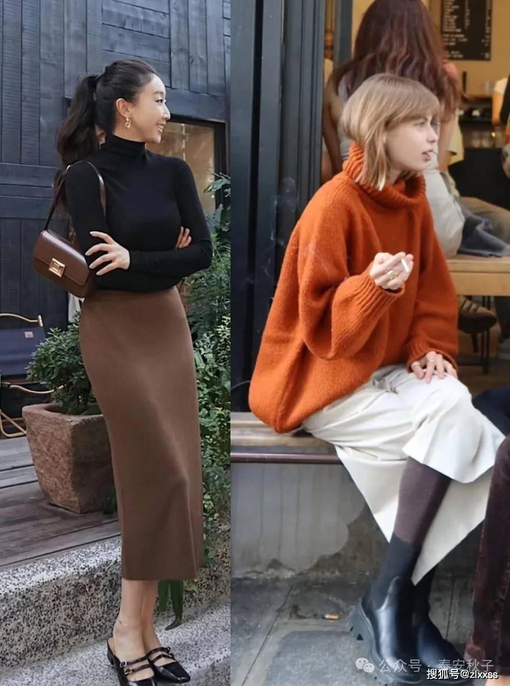 若是你没有完美的身材,那就要以遮肉显瘦的叠穿为主,推荐高领衫与半身裙的搭配:
