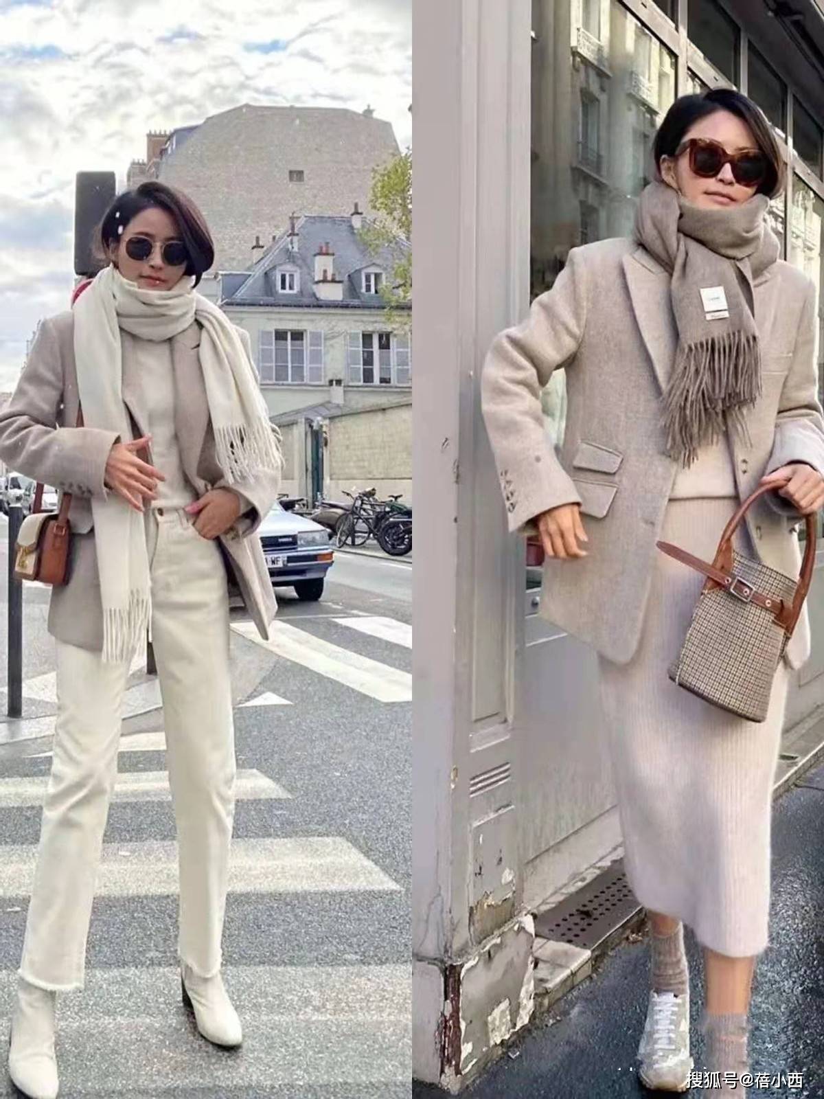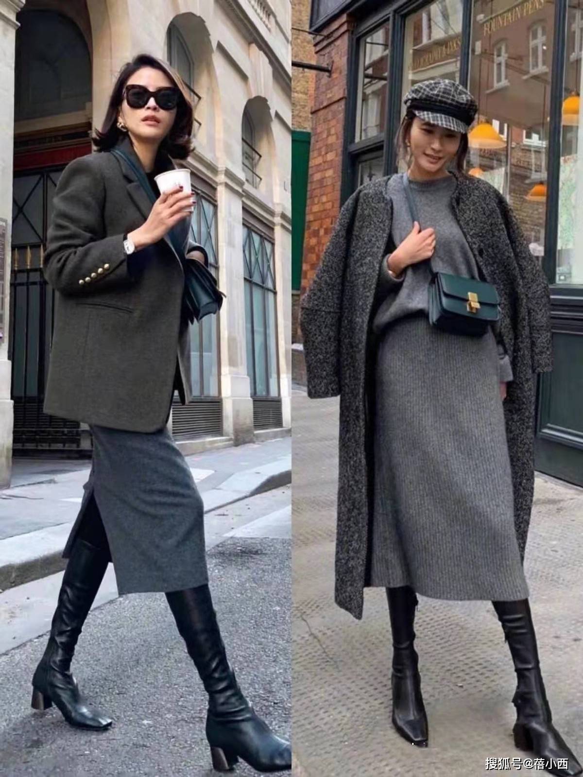 建议优先选择黑白灰、米白、卡其、燕麦等中性色,这些颜色兼容性极强,容易搭配,还能最大程度凸显服装的版型与材质。比如一件灰色针织衫搭配深灰色直筒半身裙,再配上黑色长筒靴,整体色彩统一且层次分明,简约却不单调。