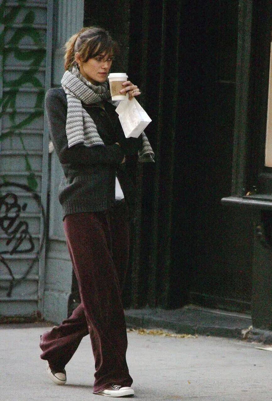 灰色针织衫搭配酒红拖地阔腿裤,踩一双帆布鞋。