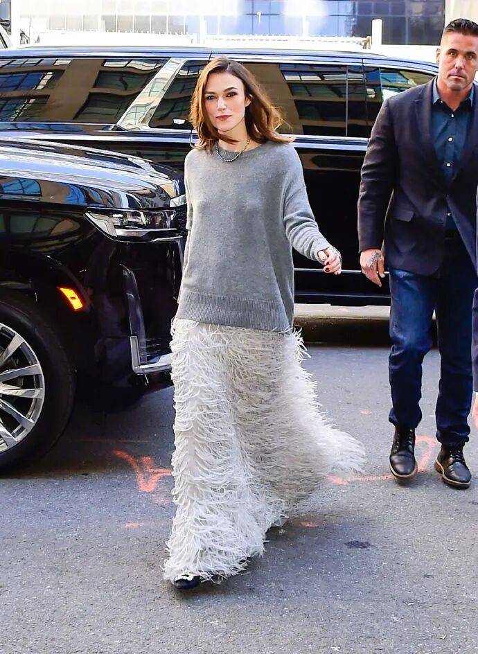 她绝不为美挨冻,用灰色毛衣搭配羽毛长裙,自然,舒服。